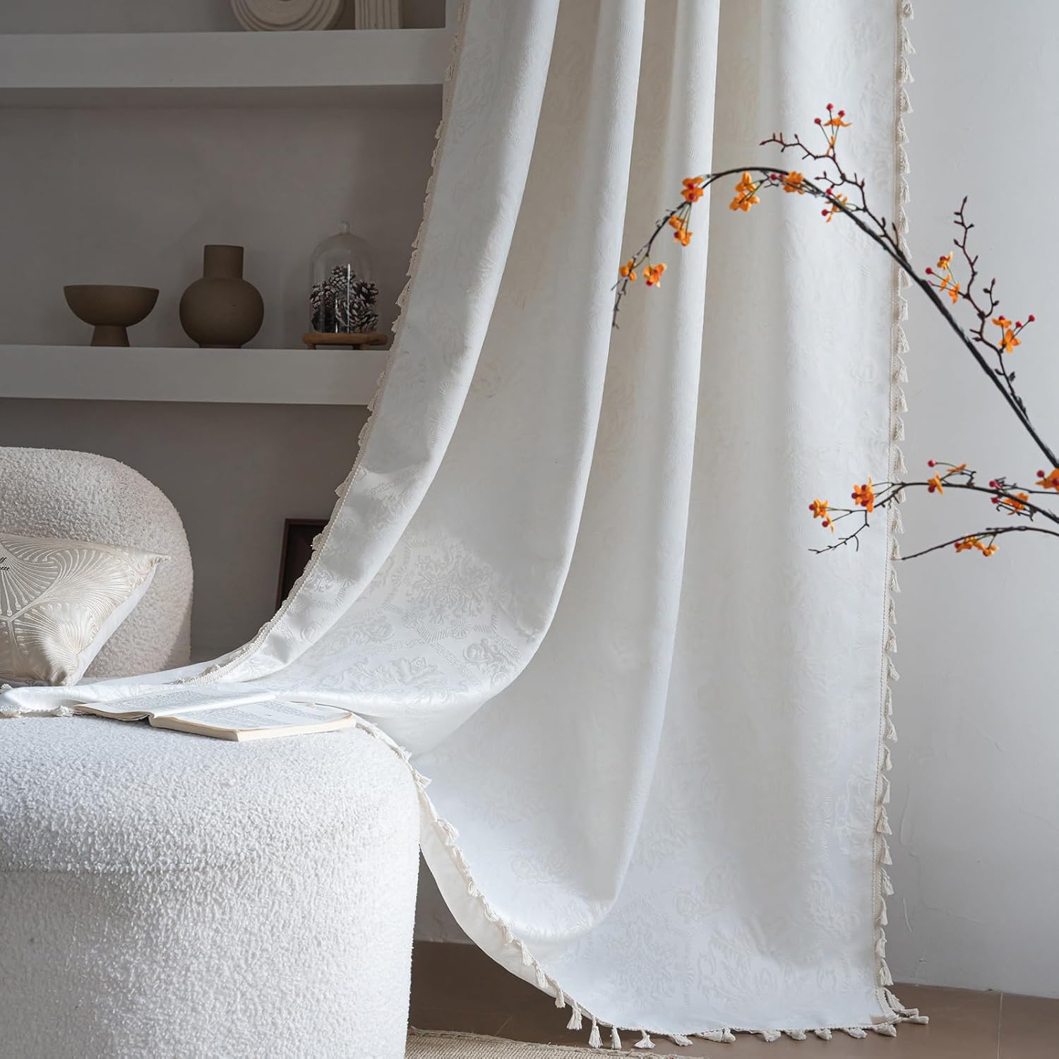 ENJOYBRIDAL Floral Living Room Curtains 96 Inch Long Boho Drapes Jacquard Semi Sheer Bedroom Patterned Window Curtains Farmhouse Country Rod Pocket Aesthetic Tassel 2 Panels Window Treatments