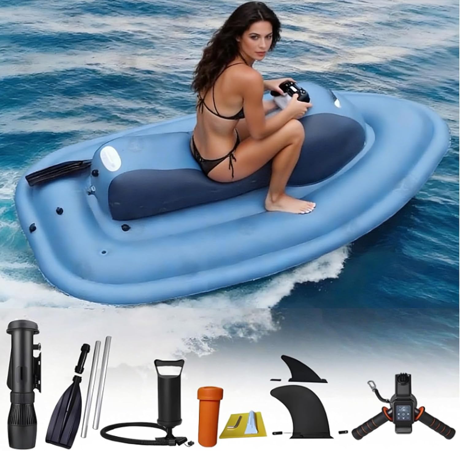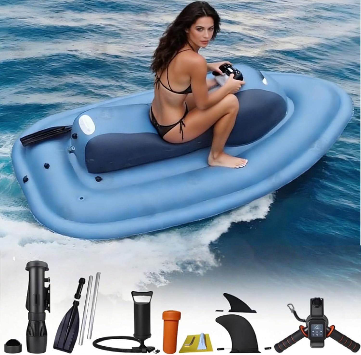 Ride the Waves in Style – Inflatable Jet Ski for Adults & Teens! Dive into pure aquatic adventure with our Premium Inflatable Jet Ski – the ultimate blend of thrill, safety, and convenience for lakes, pools, and calm coastal waters. Whether you’re a beginner or a seasoned water lover, this motorized floatie delivers heart-pounding speed and effortless control.✔ Powerful PerformanceChoose your power:500W (10A Battery): Cruise at 3–7 km/h with 40–130 min runtime700W (16A Battery): Surge ahead at 3–9 km/h with 35–160 min runtimeAlso available with 500W + 16A battery combo for 60–180 min endurance!✔ Smooth & Silent PropulsionEquipped with a high-torque electric motor (plastic housing) and adjustable water propeller (1000–2700 RPM), enjoy whisper-quiet, eco-friendly rides without gas fumes or noise pollution.🛡️ Built to Last & SafeCrafted from heavy-duty, puncture-resistant PVC material, this jet ski supports up to 150 kg (330.7 lbs) – perfect for adults and teens alike. The inflatable design absorbs bumps and provides exceptional stability on water.Size: 215 x 117 x 55 cm✔ Complete Kit Includes:Inflatable jet skiPaddleAir pumpRepair kitLarge and small fins500W / 700W electric motorOptional 10,000mAh / 16,000mAh rechargeable battery✔ Sleek, Sporty DesignBright blue with ergonomic seating and intuitive handlebars – look cool while cruising. Perfect for solo rides, family fun, or even as a unique gift!✔ Easy Setup & PortableInflates in minutes, deflates for compact storage or travel. Ideal for weekend getaways, beach vacations, or backyard pool parties.✔ Charge Fast, Ride LongerRechargeable lithium battery with smart display shows real-time power level – no surprises, just pure fun.Don’t just float – FLY across the water!If you have any questions about inflatable jet ski, you can email us, we will help you with in 24 hours